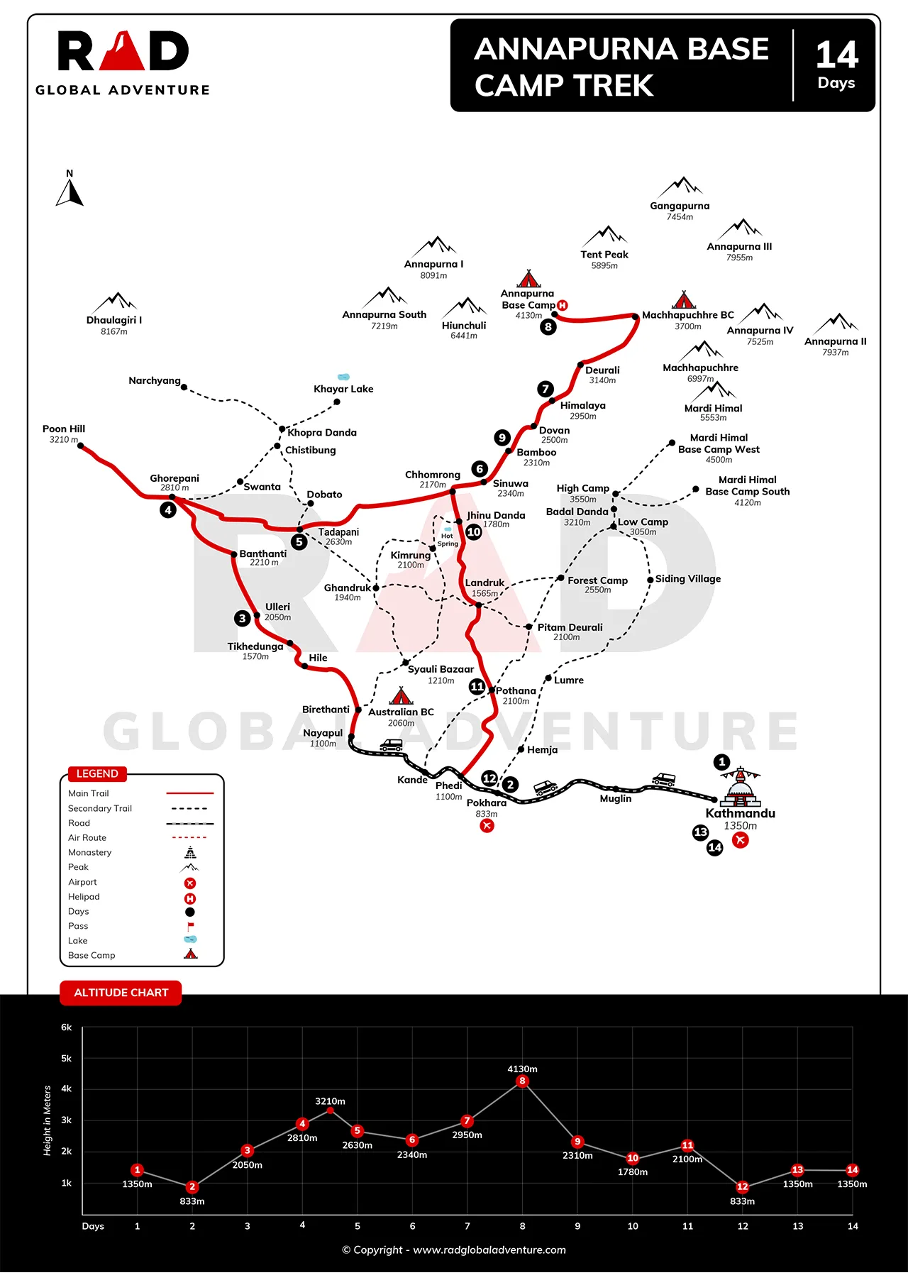 Starting our adventure we travel up to Pokhara either by road trip or flight. The road passes through sloping terraces and river valleys and gorges including Trishuli and Seti. A short flight will make the Himalayan mountains with snowy peaks appear to be visible above the clouds. Upon our arrival in Pokhara, the surface of Phewa Lake sparkles up the sight of sunset glowing Machhapuchhre (Fishtail) and Annapurna mountains.
