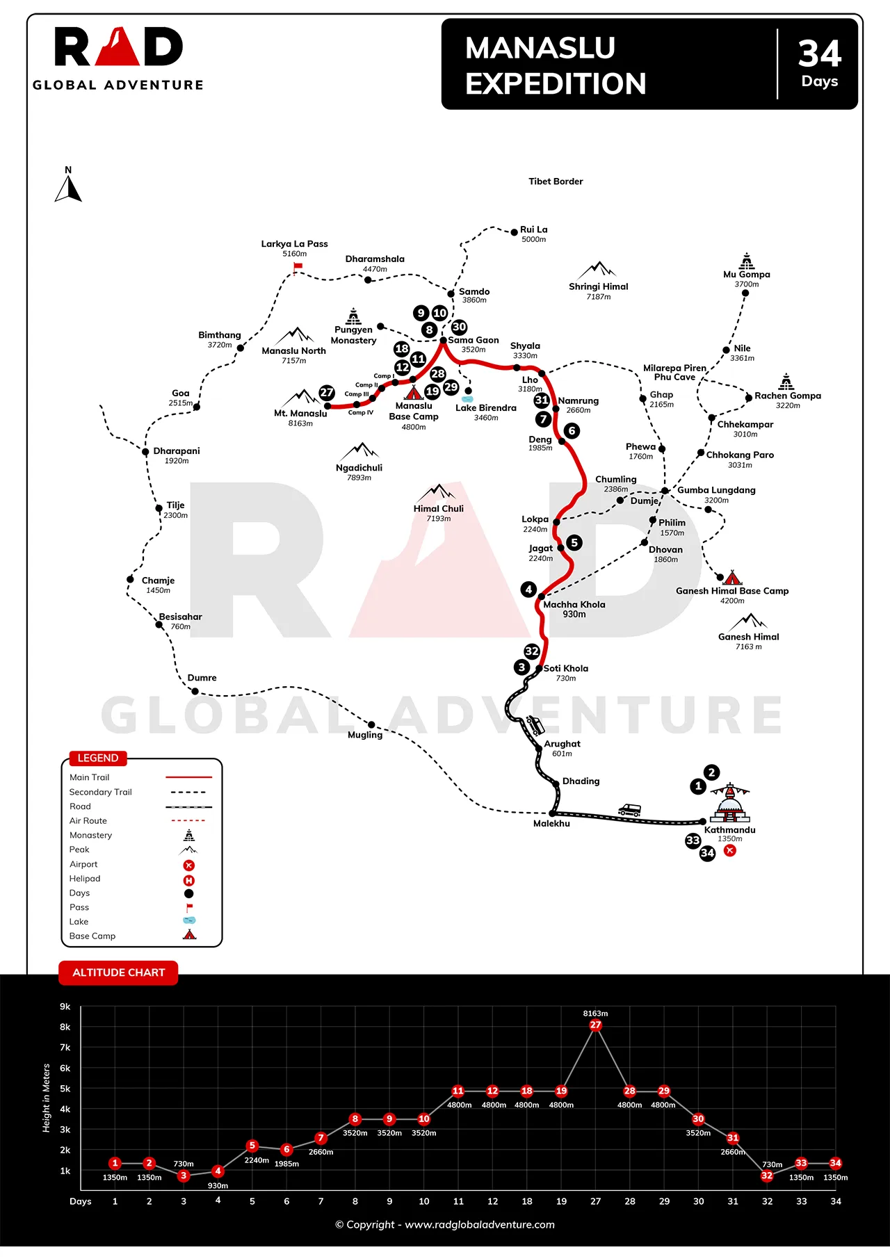 RAD Global Adventure suggests no less than a pre-visit multi-day trek and preparation prior to joining. The pace of the expedition is slow to facilitate acclimatisation and the crossing and summit push are significant challenges on the Larkya La. Novices who are ambitious can start with simpler high altitude hikes. This Manaslu hike, in Nepal, is aimed at skilled adventurers with some trekking or climbing experience. Every client should follow the instructions of the guides and should tell the truth about their health problems. To conclude, it is not a light hiking trip, so get ready to face some difficult moments.