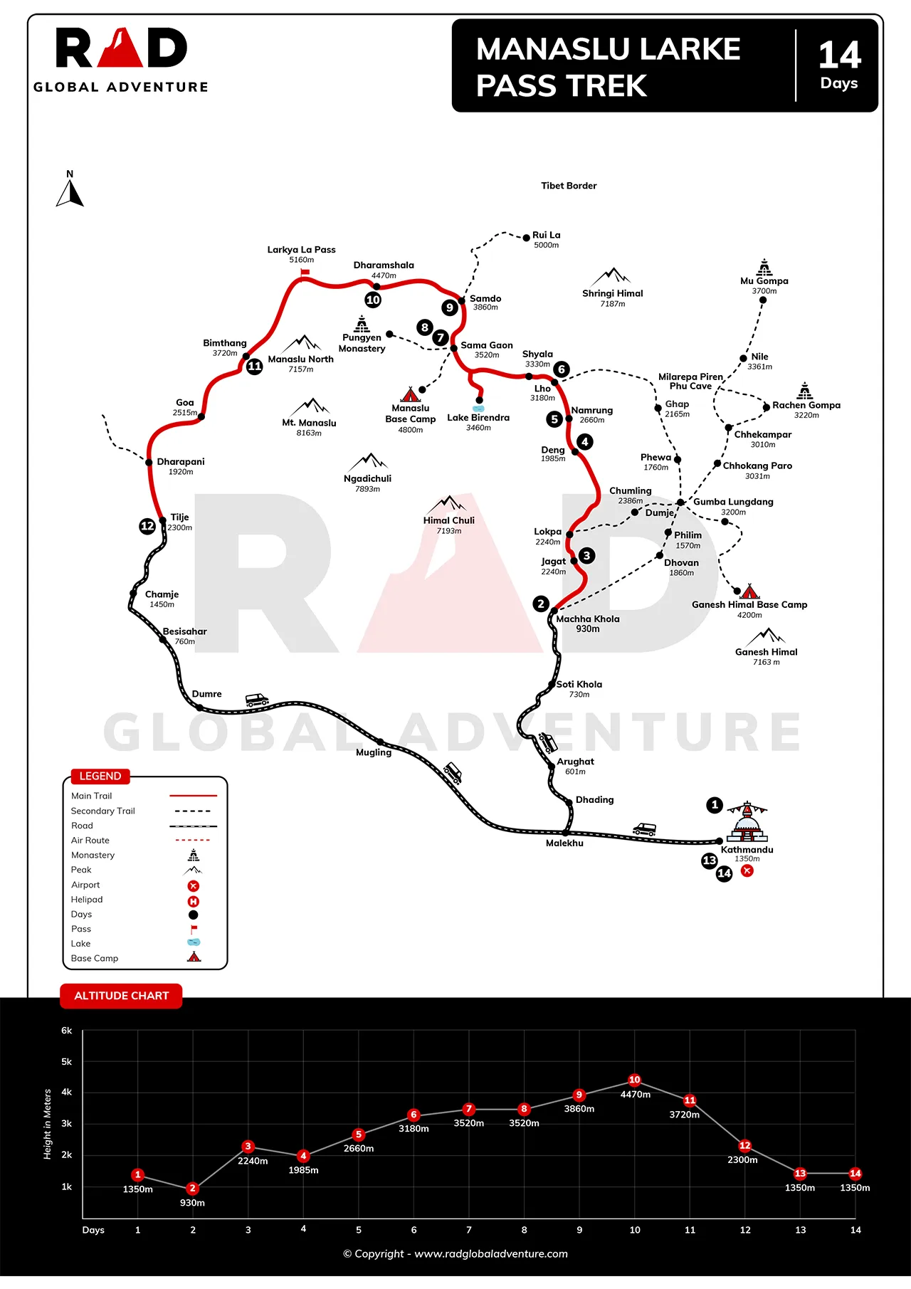 People on the trekker trail will go through places like Jagat, Deng, Namrung, Lho Gaun, and Samagaon, each of which has its own cultural experience. Scenic vistas of Manaslu, Himalchuli, Ganesh Himal, and Kang Guru are revealed along the route. RAD Global Adventure ensures that the itinerary includes acclimatization and a true experience with the local communities.
