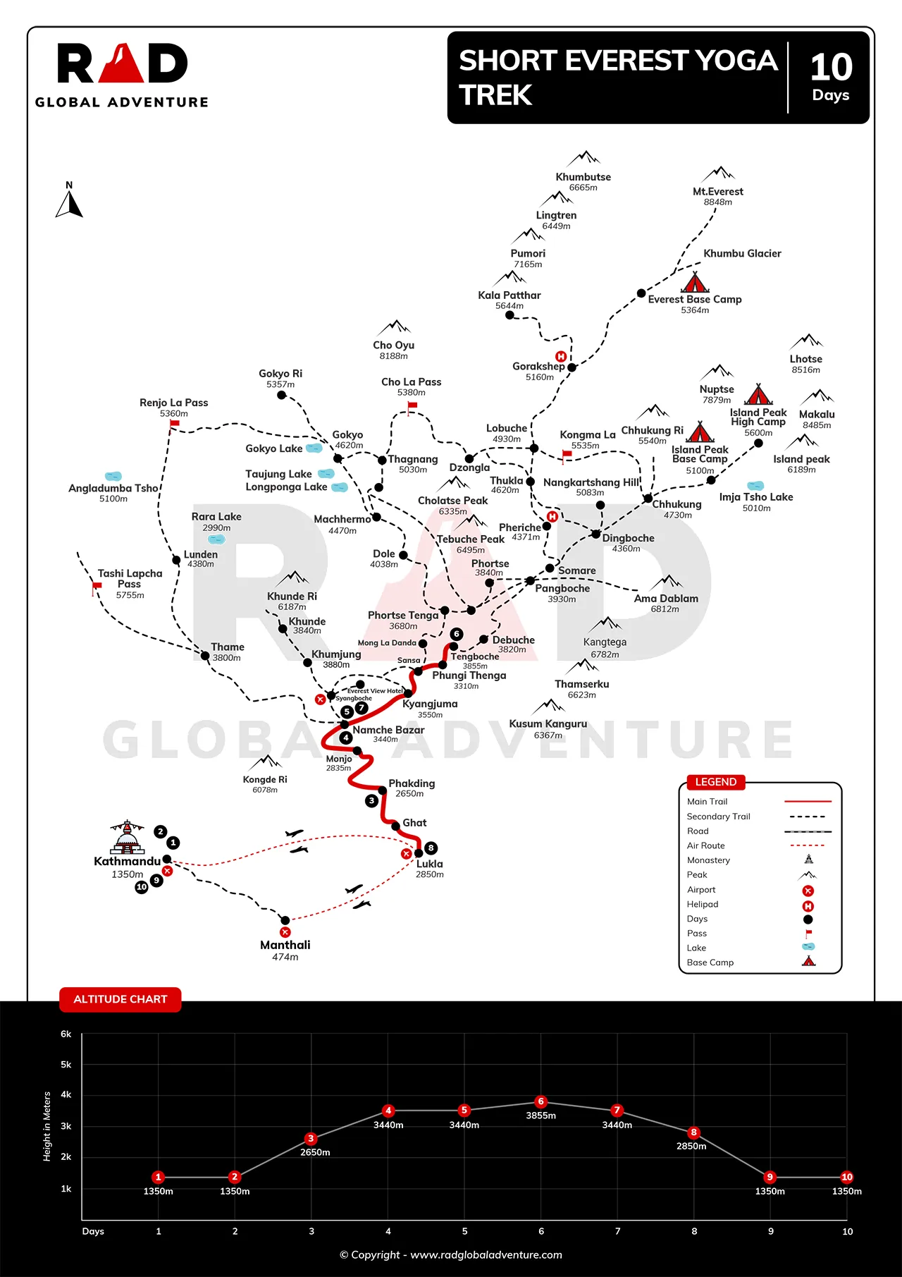 In case Lukla flights are canceled due to fog, flights may be rerouted via Ramechhap (about a 4–5 hour drive east of Kathmandu). Rest assured, RAD Global Adventure handles all transfers and logistics, so you only need to focus on trekking and yoga.